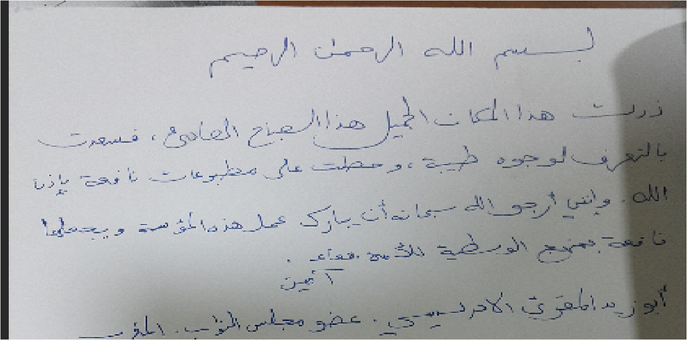 زار صباح يوم الاثنين 8/5/2017 المفكر الاسلامي عضو مجلس النواب المغربي مقر المنتدى العالمي للوسطيه والتقى بعدد من اعضاء المنتدى واستمع الى إيجاز عن النشاطات الفكرية والثقافيه التي يقوم بها المنتدى واعرب عن اعجابه بالمستوى الرفيع الذي وصل اليه المنتدى في نشر ثقافة الاعتدال والوسطيه , وقد سجل في سجل المنتدى الخاص به لكبار الزوار الكلمات التالية :
