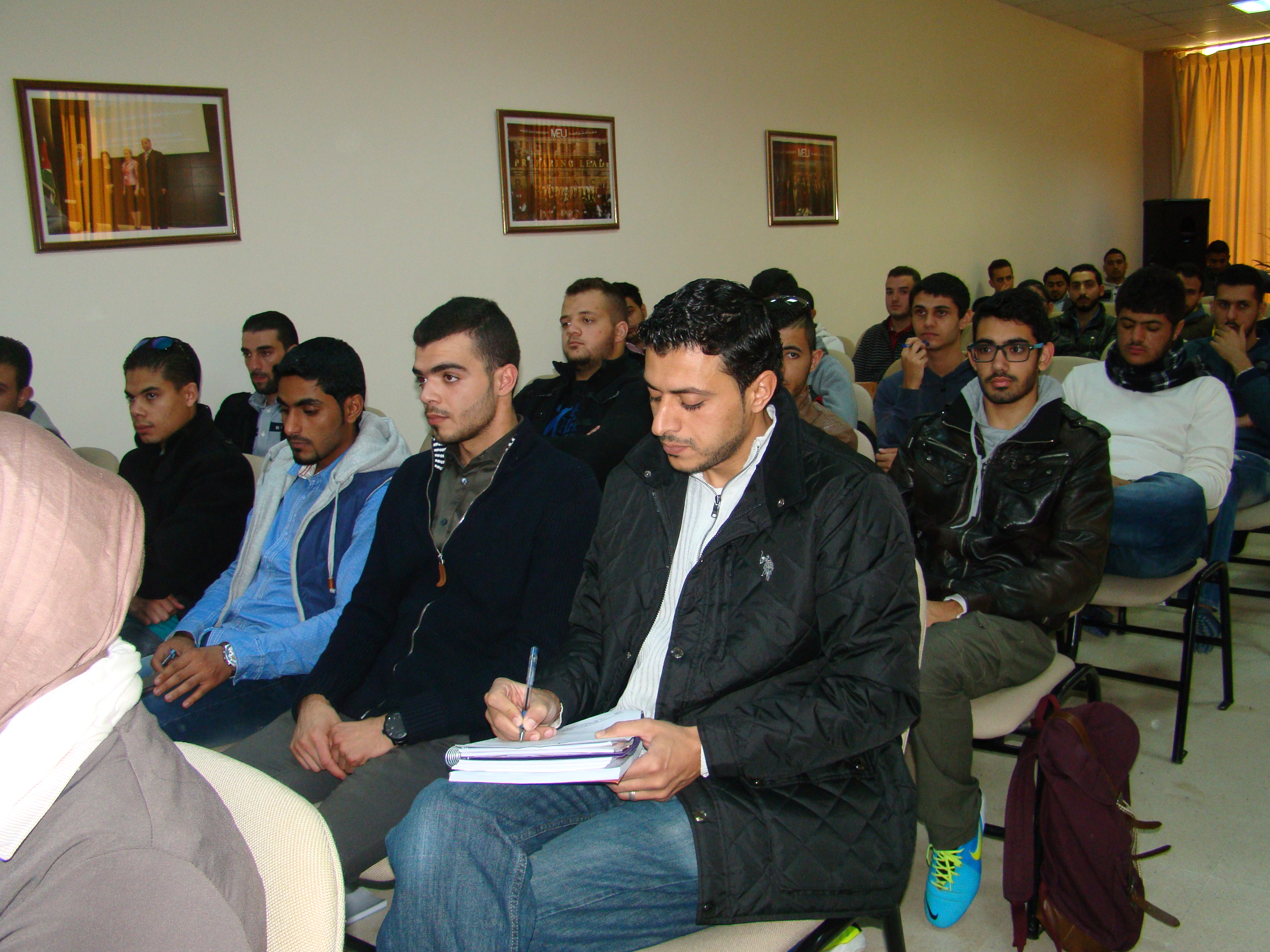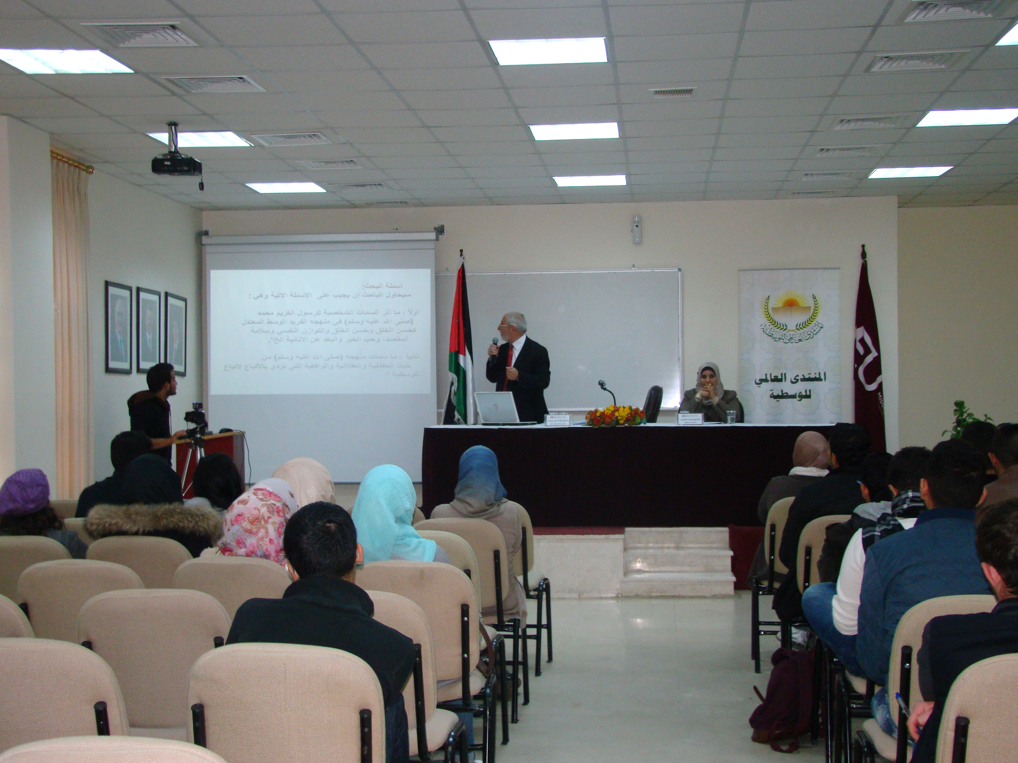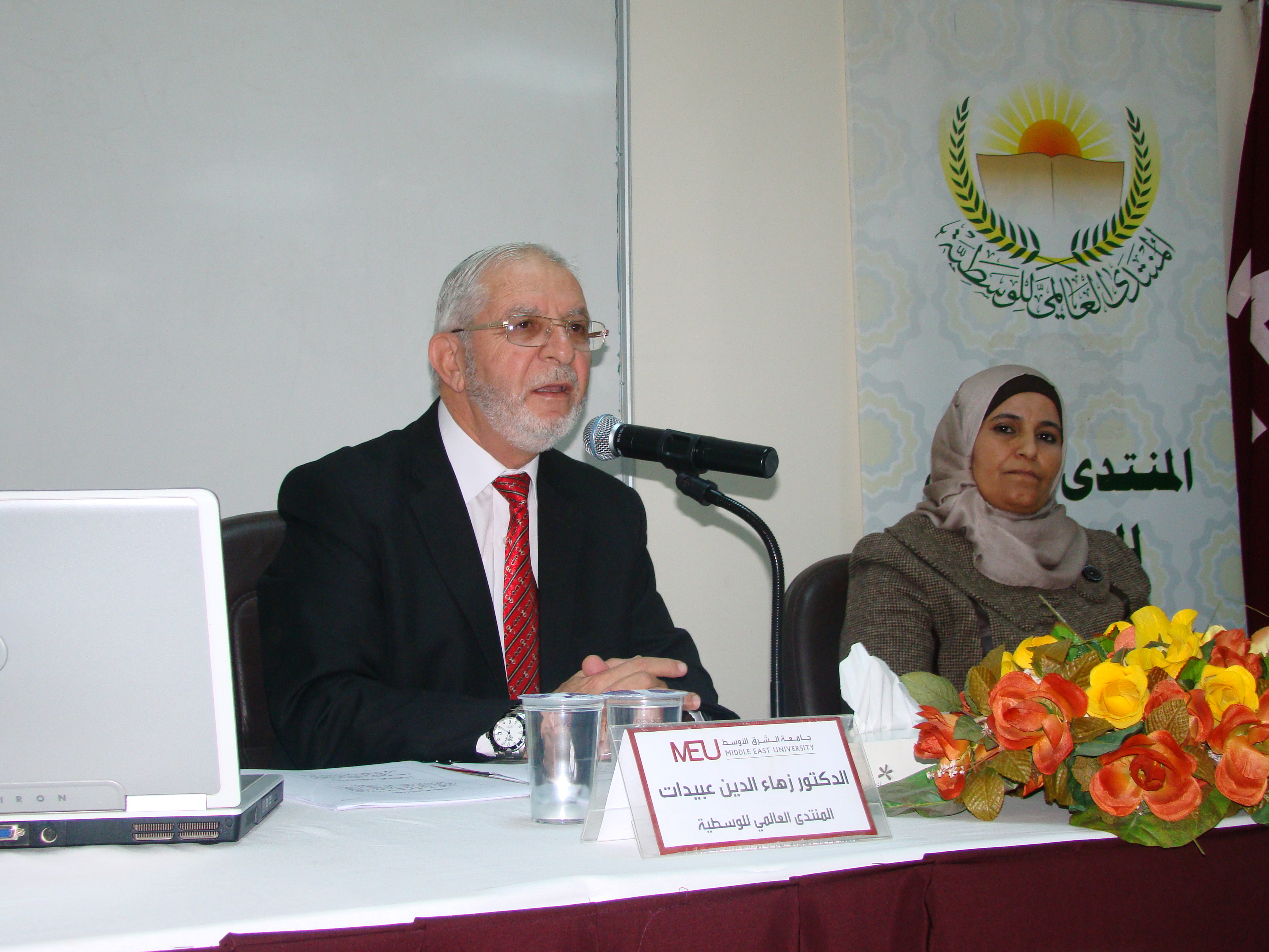 ضمن الخطة الاستراتيجية للمنتدى العالمي للوسطية لنشر الاعتدال والوسطية ومحاربة التطرف والغلو بين طلاب وطالبات الجامعات وضمن الرؤية الملكية في التصدي للارهاب بدأت سلسلة ندوات جامعية للمنتدى وكان أولها اليوم الثلاثاء الموافق 4/11/2014 في جامعة الشرق الاوسط إذ قام الدكتور زهاءالدين عبيدات بالقاء محاضرة عن منهج المصطفى محمد-صلى الله عليه وسلم-في ترسيخ الوسطية والاعتدال ،بدأها بالتعريف بالمنتدى العالمي للوسطية من حيث رؤيته ورسالته وأهدافه ،وبعد ذلك تحدث عن أثر السمات الشخصية للرسول الكريم في منهجه الفريد الوسط المعتدل،وكذلك عن ركائز هذا المنهج الوسطي الذي جعل أمته الامة الوسط التي تتسم بالتيسير ومراعاة الوسع والطاقة والابتعاد عن الغلو والتطرف وعن إبراز نماذج الوسطية في حياة الرسول الخاصة والعامة،والنصوص الواردة في ذم الغلو في الدين والتطرف في السلوك والنهي الوارد عنه - صلى الله عليه وسلم-في منع تكفير المسلمين أو قتالهم دون الرجوع للقضاء أو الحكم السلطاني وحضر المحاضرة عدد من طلاب الجامعة وأعضاء الهيئة الادارية والتدريسية في الجامعة.