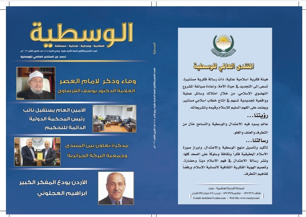 صدر عن مركز الدراسات في المنتدى العالمي للوسطية العدد التاسع والثلاثون من مجله الوسطية استكمالاً لسلسلة طويلة من الاعداد السابقة التي تتناول مسائل فكرية وثقافية ذات صلة بديننا الإسلامي الحنيف، وبكل المعارف الإنسانية ذات العلاقة .