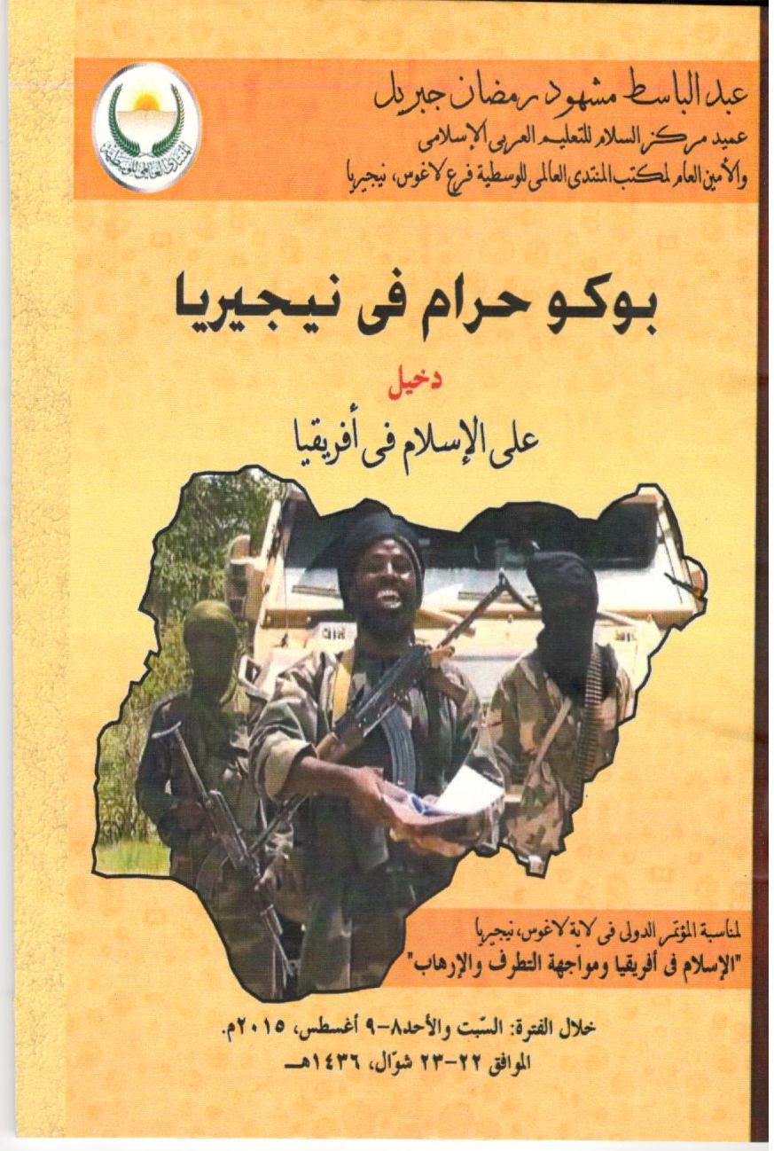 بوكو حرام في نيجيريا ،كتيب أعده المنتدى العالمي للوسطية فرع نيجيريا بمناسبة أولى مؤتمراته الدولية "الاسلام في افريقيا ومواجهة التطرف والغلو" المنعقد بمدينة لاغوس 8-9/8/2015 ،عرّف فيه الكاتب بحركة بوكوحرام المتطرفة وأسباب تطرفها في افريقيا والجرائم البشعة التي ارتكبتها وأثرها على تشويه صورة الاسلام في افريقيا ،وقد ركز الكاتب من خلال تحليله على وسطية الاسلام ملخصاً الضرورات الانسانية الخمس التي تشكل مقصداً من مقاصد الاسلام الكبرى وهي حفظ الدين والنفس والعقل والعرض والمال.
