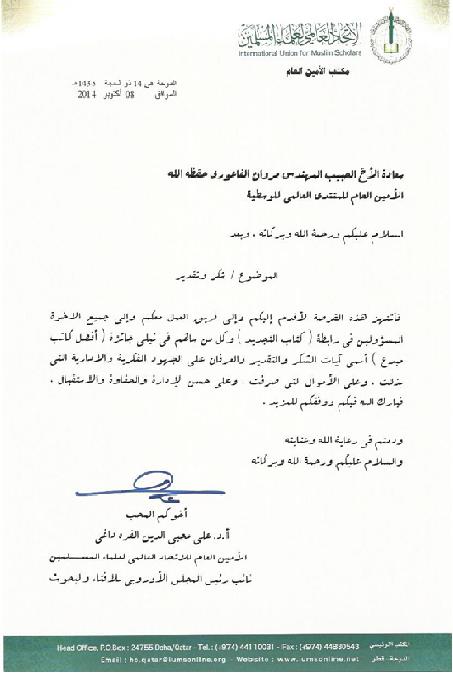 وجه الأمين العام للاتحاد العالمي للعلماء المسلمين الاستاذ الدكتور علي محي الدين القرة داغي رسالة شكر وتقدير الى المنتدى العالمي للوسطية /رابطة كتاب التجديد على منحه جائزة أفضل كاتب مبدع بحصوله على جائزة الرابطة لهذا العام تقديراً من الرابطة على جهوده الفكرية في مجال الكتابة التجديدية التنويرية وتكريمه في حفل خاص اقيم لهذه الغاية في الاحتفال السنوي الذي أقامه المنتدى لتوزيع الجوائز على الفائزين والتي كرم فيها كذلك الشيخ عبدالله بن بيه / موريتانيا والدكتور عبدالسلام العبادي في الحفل الذي أقيم في عمان16/9/2014 .