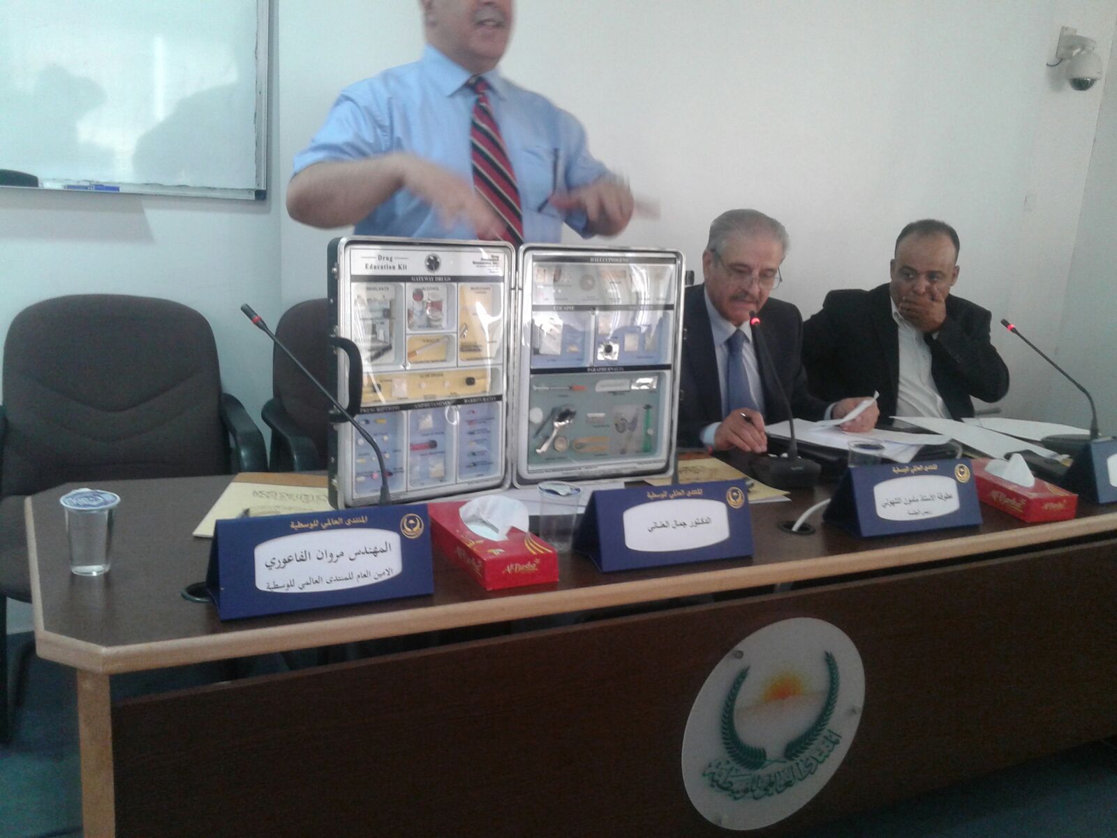 هذا وقد ترأس الجلسة الاولى عطوفة الاستاذ مأمون التلهوني أمين عام وزارة الثقافة والتي عقدت الندوة بالتعاون معا باعتباره إحدى الجهات المعنية بالمحافظة على سلامة المجتمع كما تحدث النقيب أنس رئيس قسم الدراسات في مركز مكافحة المخدرات نيابة عن العقيد سامي عسكر مدير إدارة مكافحة المخدرات وبين ان مهمة مكافحة المخدرات هي مهمة مشتركة مابين الجهات الرسمية ومنظمات المجتمع المدني في محاربة كل الآفات التي تشكل خطراً على المجتمعات وقد تناول العقيد أنس البعد العالمي للقضية واستهدافها لعدد من فئات المجتمع خاصةً ونوه الى ضرورة الحماية المبكرة للمجتمع الاردني من هذه الافات وذلك نظراً الى موقع المملكة التي تقع في محيط مضطرب وأشار في كلمته الى امتلاك قوات مكافحة المخدرات آلية متطورة للقضاء على كل الظواهر السلبية .