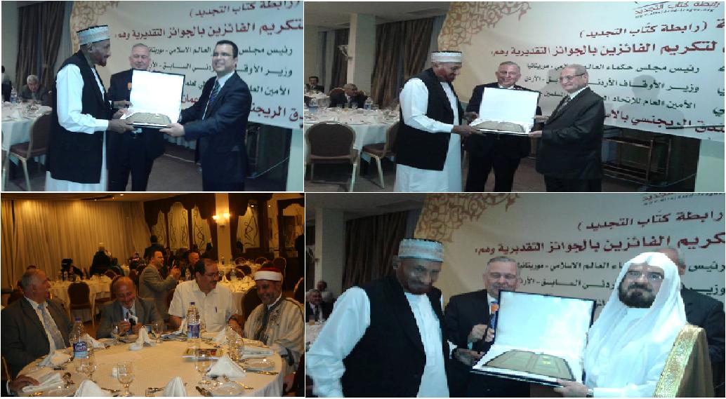 أقامت رابطة كتاب التجديد بالمنتدى العالمي للوسطية في يوم الثلاثاء الموافق16-9-2014 حفلها السنوي و للسنة الثالثة علي التوالي تشجيعاً وتقديراً للمفكرين في الاستمرار بنهجهم واضاءاتهم الفكرية المستنيرة تأصيلا للفكر الأسلامي الصحيح .* *حضرالحفل الذي نظمة الامين العام للمنتدى العالمى للوسطية عطوفة المهندس /مروان الفاعوري ومشاركة نخبة من أأمة علماء الفقة ورجال الدين والمفكرين في مجال العلوم الفقهية والشرعية.و اصحاب المعالي والوزراء.برعاية وتشريف رئيس المنتدى العالمي للوسطية رئيس الوزراء السوداني الأسبق الإمام الصادق المهدي .* *في بداية الحفل القى الامين العام للمنتدى المهندس مروان الفاعوري كلمة اعتزاز و ترحيب بالضيوف الكرام ودعوة الى لم الشمل واعادة الوئام الى صفوف شعوبنا العربية والاسلامية قال فيها : في هذه اللحظات الحرجة وما تتعرض امتنا من مخاضات صعبة * *وحرجة و دماء عزيزة تسيل في بعض اقطارنا وحروب وصراعات وفتن خلقت حالة من اليأس انتابت شعوبنا فنحن الآن أحوج ما نكون الى " لمّ الشمل" ووحدة الكلمة، وصلابة الموقف، ووضوح الرؤية والهدف، واعتقد أن هذا الجمع الكريم صورةٌ لما يجب أن تكون عليه أمتُنا لكي تتصالح مع ذاتها، وتتلمس طريق الخير بفضل الله ورشد علماء هذة الأمة وممن يحظون باحترام شعوبهم , واننا بحاجة أكثر من أي وقت مضي لوحدة الكلمة وصلابة الموقف ووضوح الهدف واعتقد أن هذا الجمع الكريم هو صورة لما يجب ان نكون .* *وأكد الفاعوري علي أن اعدائنا ليسو فقط الغزاة ومن يتربصون بنا خارج حدودنا انما اعداؤنا من أبناء جلدتنا ممن يتحدثون لغتنا ويعتقدون احيانا ديننا وهذا هو المؤسف .* *وقال مشددا أن رسالة الاسلام هي رسالة الاعتدال والوسطية تفرض علينا أن نكون صادقين مع أنفسنا لنخلص النصيحة للوطن , وان طريق المصالحة هو تصحيح البدايات بالاجماع والتوافق واحترام الاختلافات واستيعاب الجميع في مشروع حكمة يوجة طاقات الشعوب وقدرات العلماء الي الي كلمة سواء وهي حب وبناء الوطن .* *وجاءت كلمة الامام الصادق المهدي مشبها فيها الامة العربية وما تتعرض له من انقسامات و تقاطعات حول الرأي مابين الفكر الاسلامي والفكر العلماني أشبه " بالبناء المهدم " وأسوا ما في الامر أن عوامل الهدم ذاتية .وأن مايفعلة العدو ليس غريبا ولكن المشكلة أن قضايانا ذاتية . وان هناك مواقف مهمة وكيف نتعامل مع العصر بالصورة التي لا تأسرنا .* *وأشار الامام الي الصدام القائم بين السنة والشيعة وبين الاخوان والحركة السلفية وما يترتب علية من تدهور خارجي , لا ينبغي أن يكون على حساب شعوبنا وبين أنفسنا .* *وقال في ظل مايوجد من معاملات وقضايا متغيرة فإن التشخيص الصحيح هو المخرج وان يكون الامر بيننا شورى وليس بالتدخل الاجنبي كما حدث في العراق وأفغانستان . وهذا افضل علاج للخروج من هذة الازمة .* *وفي نهاية الحفل قاما الامام المهدي وعطوفة الامين العام للمنتدي بتسليم الدروع وجوائز التكريم التي بلغت قيمتها " 5000 " دولار للجائزة الواحدة والتي يقدمها منتدى رابطة التجديد سنويا على الفائزين من العلماء والمفكرين الإسلاميين كأفضل عالم مبدع في العالم و الفائزين لهذا العام وهم * *معالي الدكتور العلامة عبدالله بن بيه رئيس المركز العالمي للتجديد والترشيد/موريتانيا.* * *سعادة الدكتور علي محي الدين القرة داغي الأمين العام للاتحاد العالمي لعلماء المسلمين /العراق.* * *معالي الدكتور عبدالسلام العبادي وزير الاوقاف الاردني السابق.* * *وقبل تسليم الدروع والشهادات عرض فيلم تسجيلي استعرض فية مسيرة المكرمين طوال مشوار حياتهم الزاخر بالاجتهاد والعطاء تلاها كلمة شكر وعرفان منهم بهذة المناسبة , وفي نهاية الحفل كان الجميع علي موعد لتناول طعام العشاء المعد لهذة الاحتفالية الكريمة